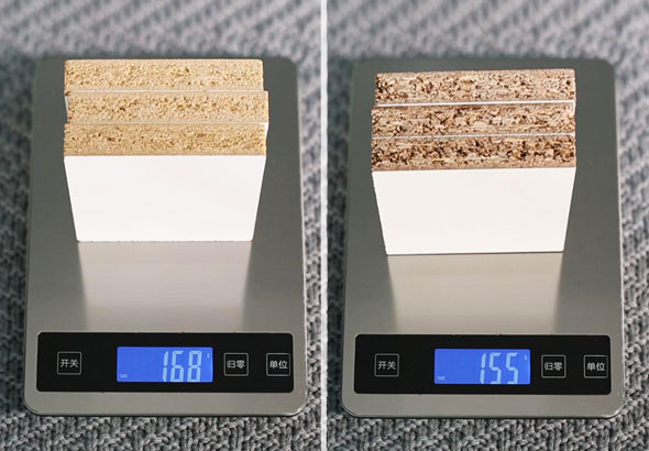 準(zhǔn)備好三塊同樣大小、同樣厚度的竹香板和顆粒板樣品,放在電子秤上稱量,兩者的重量分別為168g和155g,可以看到竹香板在重量上有明顯的優(yōu)勢。