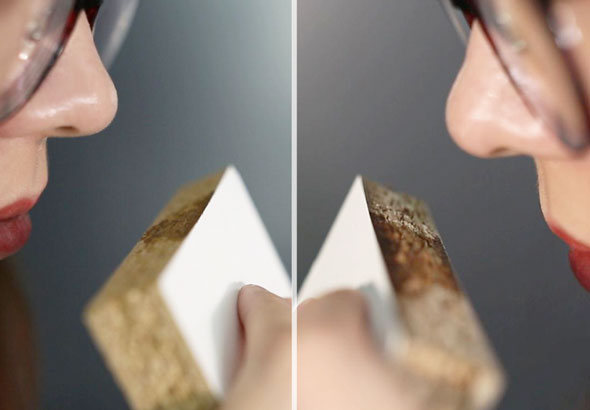 最后,我們要對它們“動刀”了。用小刀分別對竹香板和顆粒板的截面進(jìn)行刀削,通過觀察兩者的碎屑觀察可知,竹香板碎屑比較均勻,而顆粒板的碎屑有大有小,略為粗糙。